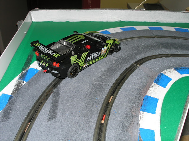 En esta foto y la siguiente se ve como he pintado de verde parte de los tramos de pista, la idea es que parezca que el coche se sale y se mete por la hierba para incorpararse de nuevo a la carrera.
